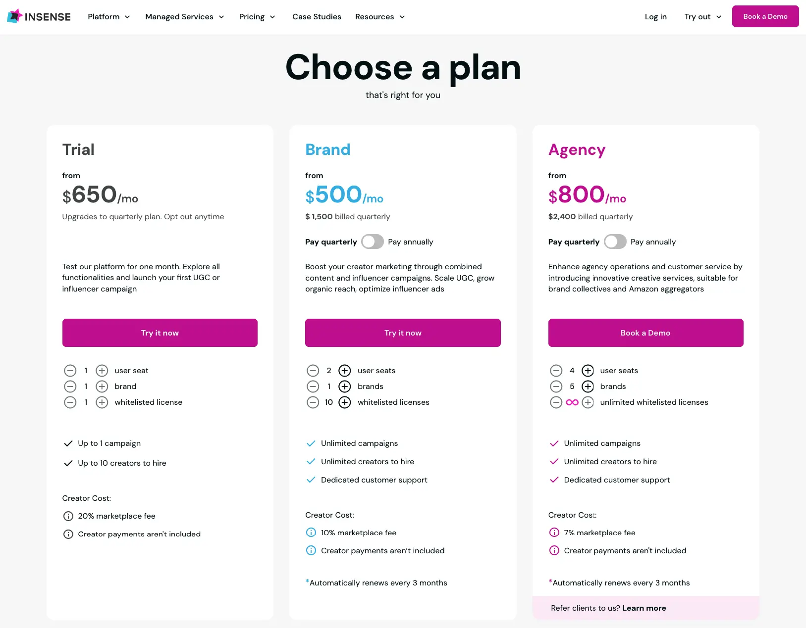 Insense offers four customized pricing plans. The least expensive is our UGC plan starting at $500 per month.