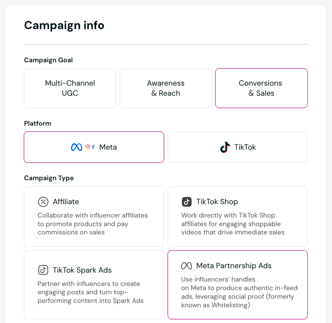 It’s also helpful to specify at this point that you’ll need permission for Meta Partnership Ads or TikTok Spark Ads.