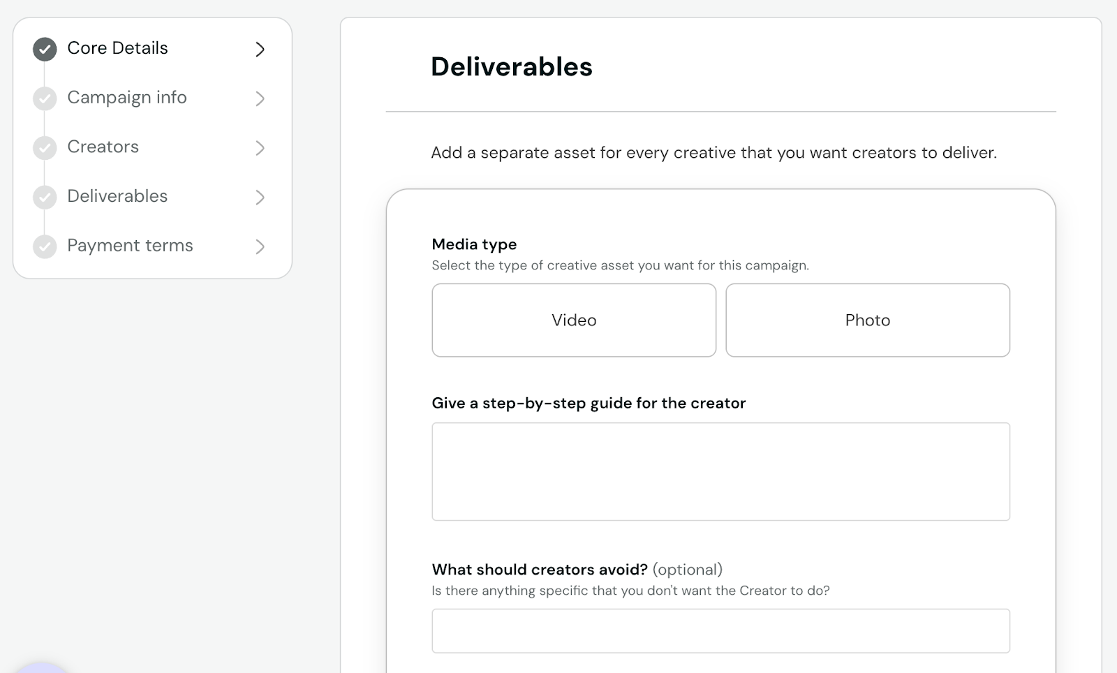 Using the creative brief template, you can outline the deliverables you want, goals, format, and any other information creators might need.